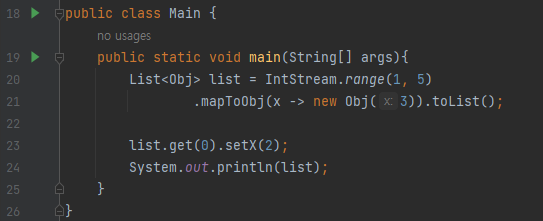 그런데 3이 출력되었습니다. 이유는 toList가 호출될 때 mapToObj에 있는 apply인 x -> new Obj(3)가 실행되기 때문입니다. 각각의 element에 대해 적용되기 때문에 별개의 새로운 오브젝트 Obj가 생성됩니다.