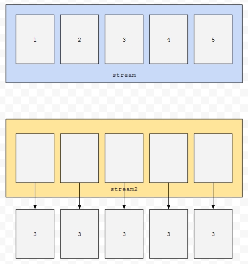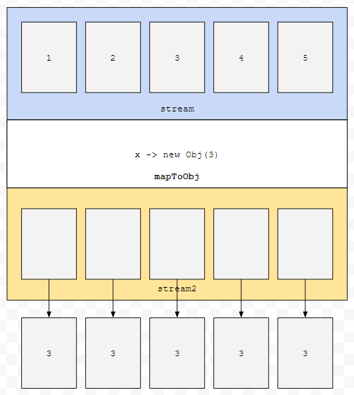 그림으로 그리면 이런 상황인 셈입니다. 즉, mapToXXX는 스트림의 요소들을 다른 요소로 바꾼 새로운 스트림을 돌려줍니다. 위 그림에서는 x를 new Obj(3)으로 바꾸었습니다. 따라서, 1 2 3 4 5로 이루어져 있던 것을 new Obj(3), ... , new Obj(3)으로 대체하게 됩니다.