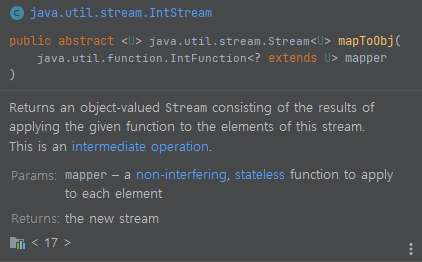 mapToObj 메서드를 봅시다. Intstream 뿐만이 아니라, Longstream과 DoubleStream에도 있습니다. 설명을 보면, 스트림으로부터 해당 함수를 적용한 객체 값들의 stream을 반환한다고 되어 있어요. 즉 입력 스트림으로부터 무언가를 받아서, 새로운 결과 가지고 있는 스트림으로 변환합니다.