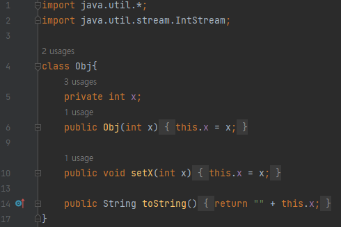 그러면, 1부터 5까지 순서로 이루어진 Stream이 new Obj(3)으로 이루어진 4개의 객체로 이루어 집니다. 참고로 각 원소별로 apply가 별개로 동작하므로 매번 새로운 객체가 생기게 됩니다.
