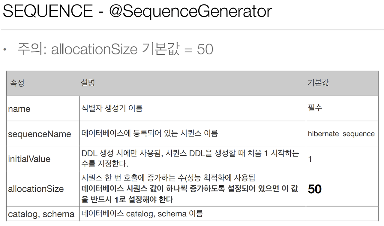 sequenceName 으로 시퀀스를 분리하여 지정할 수 있고, allocationSize로 한 번에 사용할 시퀀스 덩어리 사이즈를 정해서 최적화 할 수 있다.