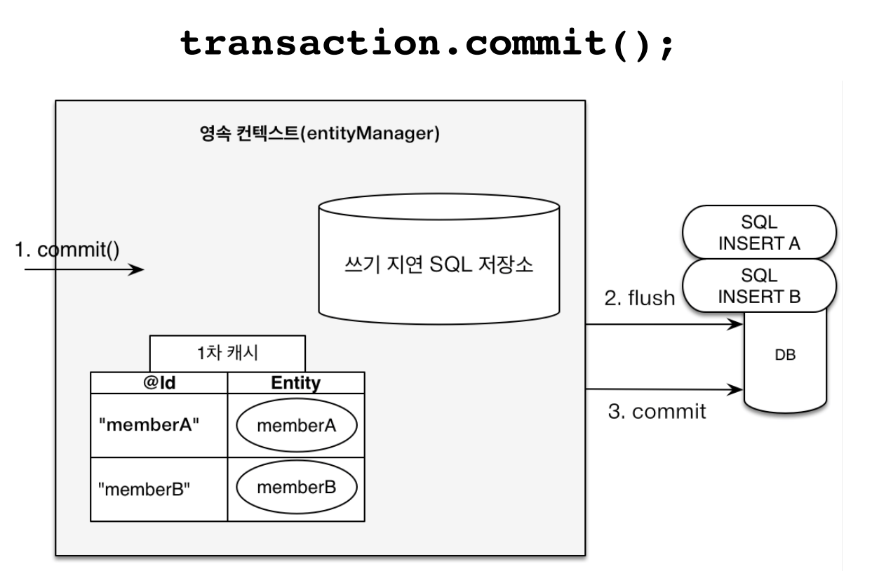 JPA는 보통의 경우에, 트랜잭션이 commit 되는 시점에 쓰기 지연 저장소에 모아놓은 SQL을 한 번에 DB로 전송하며 실행한다. 이렇게 해야 어플리케이션과 DB 사이에 네트워크를 오가는 횟수가 줄어들고 성능면에서 이득을 볼 수 있기 때문이다.