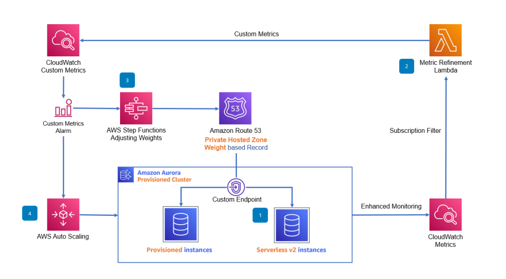 커스텀 Aurora 오토스케일링 아키텍처에서는 다음과 같은 로직으로 데이터베이스 부하를 처리합니다.