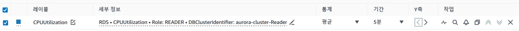 - 만약, 기존 프로비저닝 된 Aurora Cluster의 읽기 전용 인스턴스의 평균 CPU 부하량이 임계치를 넘으면 알람을 발생합니다.