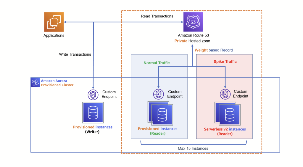 순간적인 스파이크 트래픽을 대응하기 위해 기존에 프로비저닝 된 Aurora Cluster에 Serverless v2 읽기 전용 인스턴스를 추가합니다. Serverless v2 읽기 전용 인스턴스를 최하위 우선순위로 설정해서 Fail-over 발생시, 쓰기 인스턴스로 승격되는 것을 방지할 수 있습니다. Serverless v2 읽기 전용 인스턴스를 여러 대 생성하면 더 급격한 스파이크 트래픽도 대응할 수 있습니다.