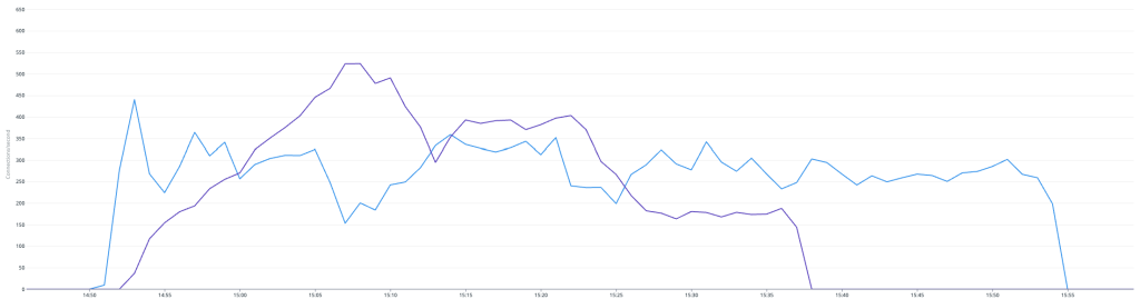 또한, 오토 스케일일링으로 인해 Scale-out이 일어난 후에는 Serverless v2 읽기 전용 인스턴스로 전환되는 트래픽의 비율을 점진적으로 낮추고 Scale-out이 완료된 이후에는 모든 트래픽이 Provisioned 인스턴스로 전환되는 것을 확인할 수 있습니다.