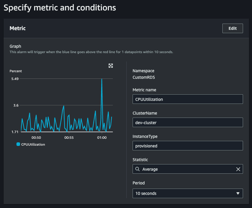 위에서 생성한 커스텀 메트릭을 이용하여 Cloudwatch Alarm을 생성합니다. 높은 데이터베이스 부하 알림 데이터 포인트는 적게, 낮은 부하 알림 데이터 포인트는 높게 설정하는 것으로 시스템 안정성을 높일 수 있습니다. AWS 네임스페이스 메트릭이 아닌 커스텀 메트릭을 사용할 경우, 알람의 데이터 포인트 주기를 최대 10초 까지 높일 수 있는 장점이 있습니다.