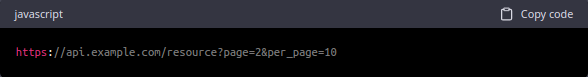 Using query parameters: In this approach, the client includes pagination parameters in the query string of the API request URL. The most common pagination parameters are "page" and "per_page", which indicate the current page number and the number of results per page, respectively. For example, to retrieve the second page of 10 results per page, the client would send a request to the API with the following URL:
