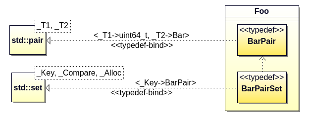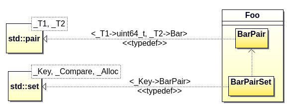 or to stereotype the realization with typedef-bind and to use the stereotype typedef for BarPair and BarPairSet