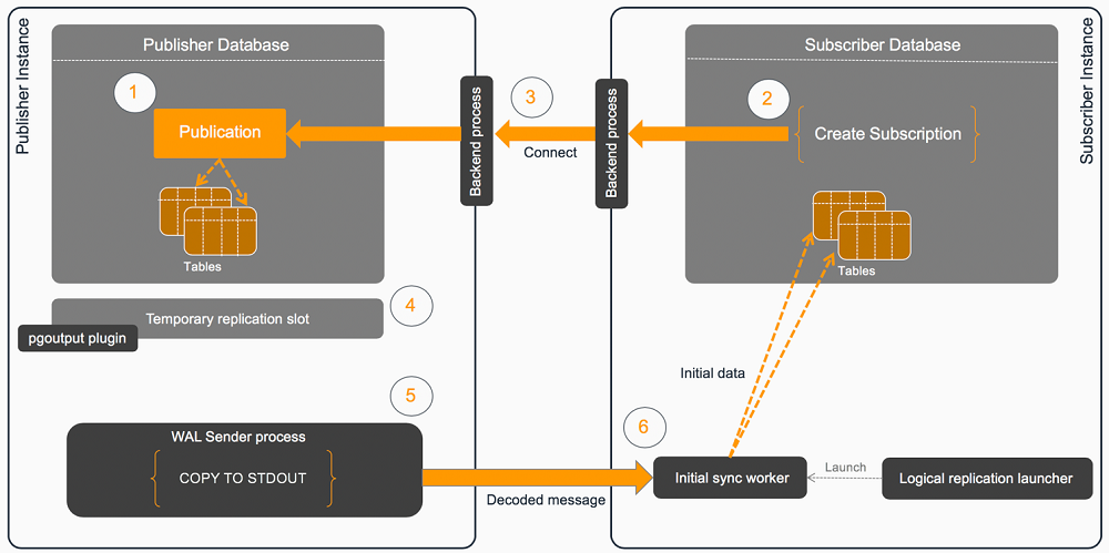 - An incoming connection from the subscriber triggers the creation of a temporary logical replication slot at the publisher (under a logical decoding plugin called pgoutput).