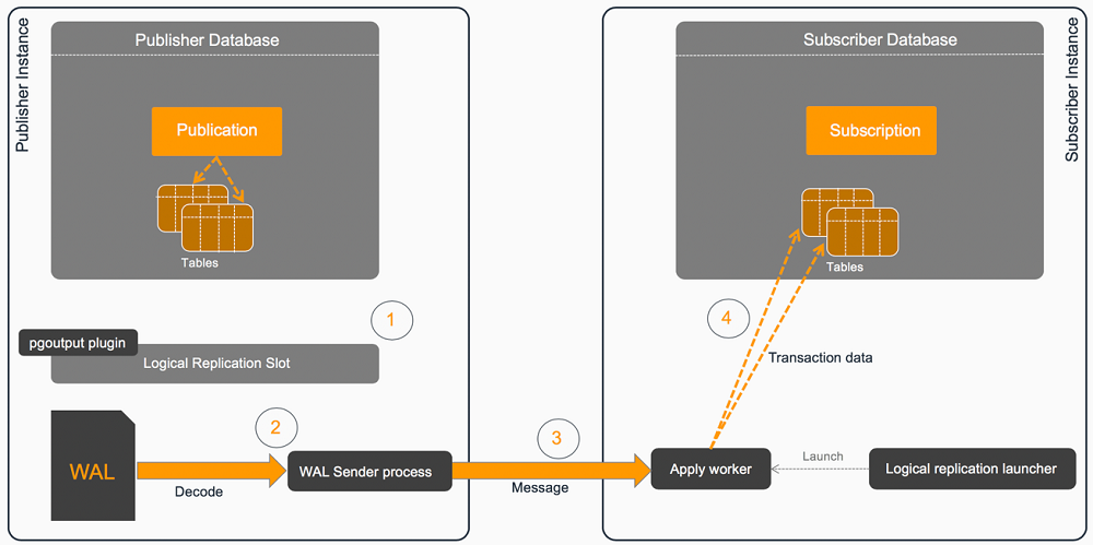 Logical replication uses a publish and subscribe model wherein subscribers pull data from the publications they subscribe to. Logical replication starts by copying a snapshot of initial existing data on the publisher database. When complete, the changes on the publisher (INSERT, UPDATE, and DELETE) are relayed to the subscriber in near-real time. The subscriber applies data in the same order in which commits were made on the publisher to ensure transactional consistency.