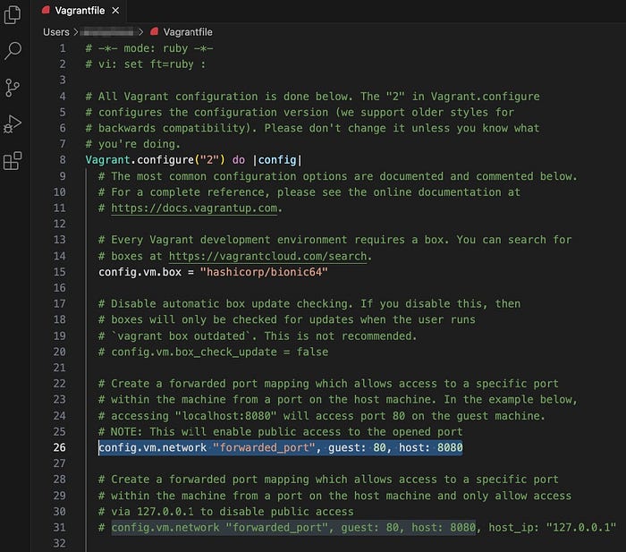 Open the vagrant file using a studio code so that we can make changes to the vagrant file easily. Here I have added a line in order to forward the port from guest to host.