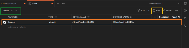🎯 Set the name of the Environment [green], the base URL, and click the save button