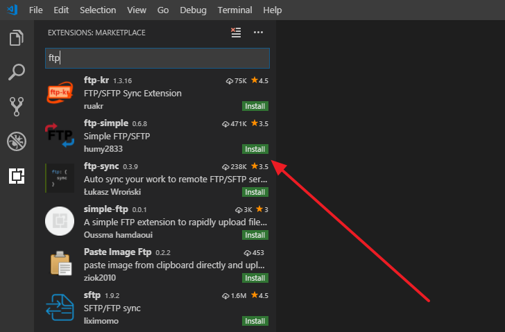 - 확장기능(Extension)에서 ftp로 검색합니다. 여러 가지 확장기능이 있는데, 그 중에서 ftp-simple을 설치합니다.