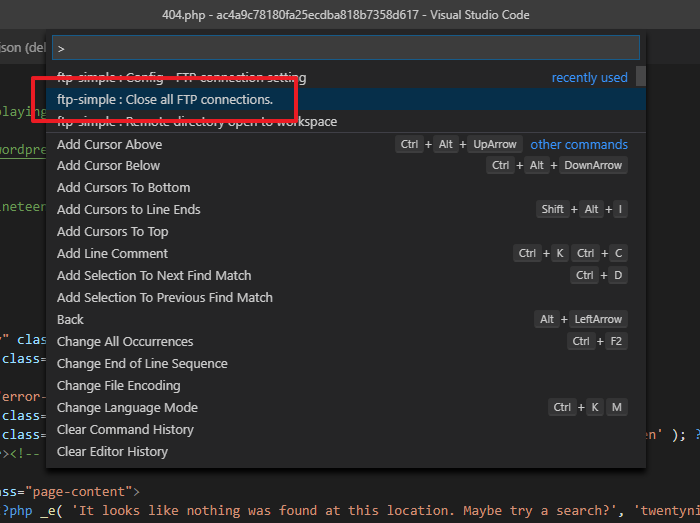 - 서버와의 연결을 끊으려면 ftp-simple:Close all FTP connections를 실행합니다.