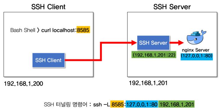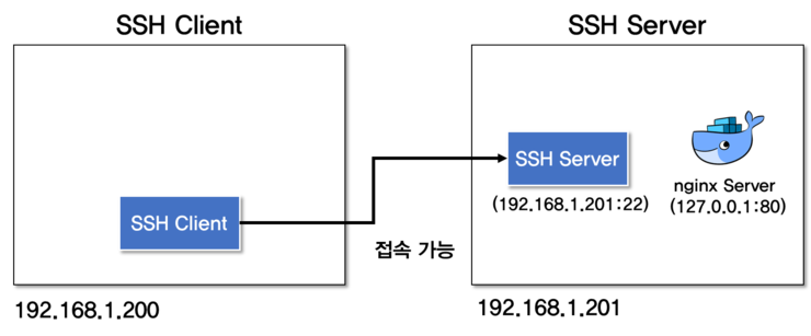 SSH Client는 SSH Server에 SSH로 접속할 수 있다. 그러나 Nginx 서버는127.0.0.1:80으로 바인딩되어 있어 외부에서 접근할 수 없는 상황이다. SSH Client 에서 Nginx에 접근할 수 있도록 SSH 터널링 연결을 생성한다.