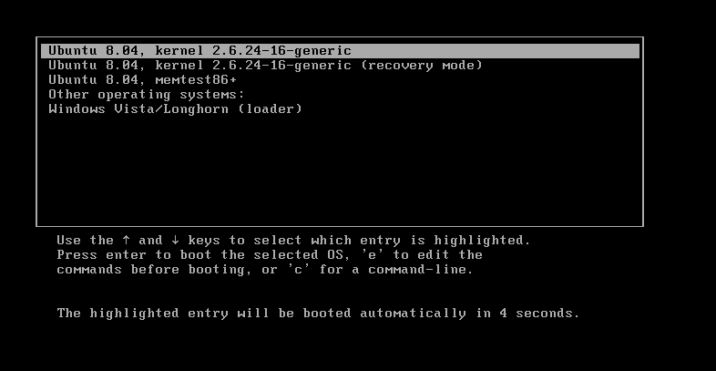 A GRUB startup menu showing Ubuntu Linux (with three different boot modes) and Windows Vista options
