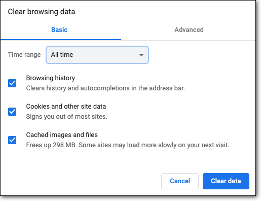 Choose the time range ‘All Time’ or one that is according to your preference. Next, click ‘Clear data’ and the cookies will be deleted from your browser’s history.