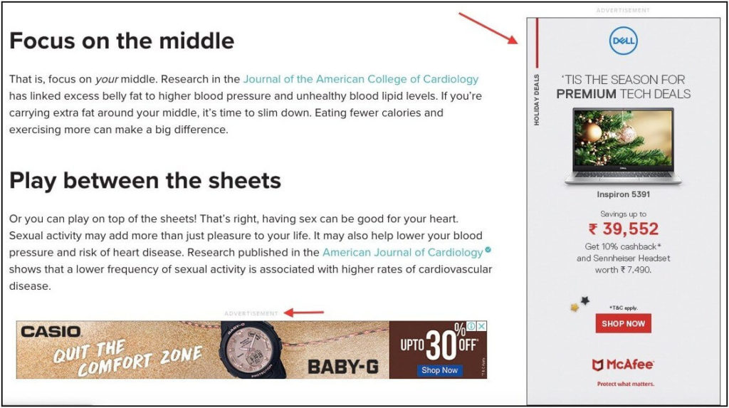These ads usually reflect your recent search history. For example, if you searched for ‘laptops’ on Google, you’ll notice that ads on all websites show you ads for dell. These ads are not a part of the website but are handled by services like Google Adsense.